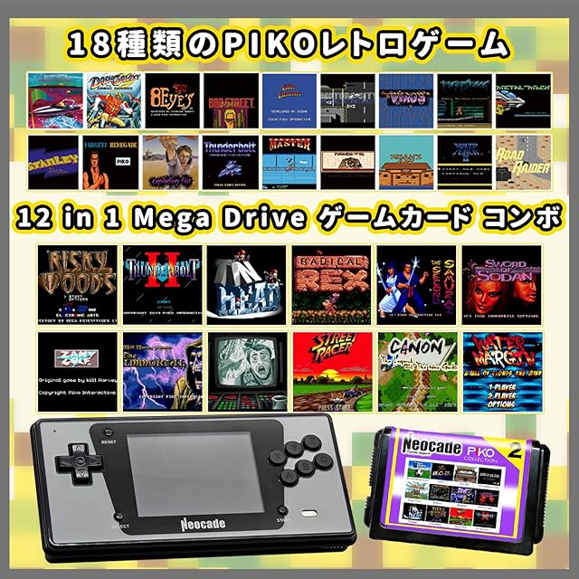 【クラシックを再体験、無限に楽しむ】 NEOCADEレトロハンドヘルドゲーム機には18種類の懐かしいNES(PIKO)レトロゲームが内蔵されています。それに加え、12本のゲームが収録されたMDカートリッジが付属! 30タイトルのゲームを存分にお楽しみいただけます。家族や友人と一緒に盛り上がるには最適の一台です!