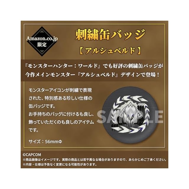 刺繍缶バッジ 新モンスター:『モンスターハンター:ワールド』でもご好評いただいた刺繍缶バッジが新デザインで登場します。モンスターアイコンが刺繍で表現された、特別感ある珍しい仕様の缶バッジです。お手持ちのバッグに付けるも良し、飾っていただくのも良しのアイテムです。サイズ:56mmΦ