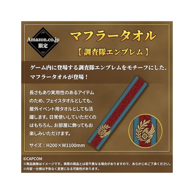 マフラータオル 調査隊エンブレム:「モンスターハンター」の世界に登場する「調査隊エンブレム」をモチーフにしたマフラータオルが登場します。長さもあり実用性のあるアイテムのため、フェイスタオルとしても、屋外イベント用タオルとしても活躍します。日常使いしていただくのはもちろん、お部屋に飾ってもお楽しみいただけます。サイズ:H200×W1100mm