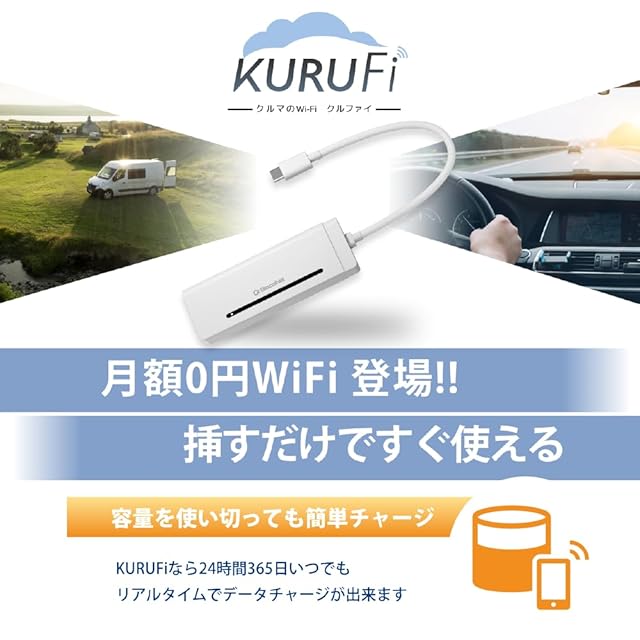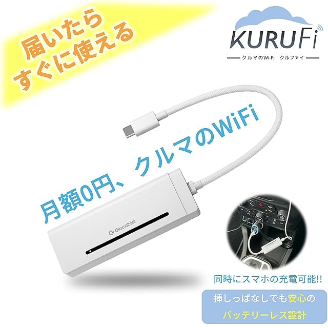 <b>SIM不要・契約不要!挿すだけですぐ使える次世代クラウドWi-Fiルーター「KURUFi(クルファイ)」が登場。</b><br><br> KURUFiは、クラウドSIMテクノロジーを搭載した車載専用Wi-Fiルーターです。SIMカードの挿入や面倒な契約手続きは不要。USB Type-C接続で電源を供給するだけで、どこでもWi-Fi環境が完成します。さらに、Type-A変換アダプターも付属しているため、ほとんどの車種でご利用可能です。<br><br> <b>■【こんな方におすすめ】</b><br> ・車内でも快適にインターネットを利用したい<br> ・ドライブ中の子供の動画視聴やゲームの利用に<br> ・キャンプや旅行先、車中泊でのネット利用に<br> ・テレワーク中のサブネット環境に<br><br> <b>■【他にもこんな使い方も◎】</b><br> ・電源アダプターを利用すれば、車以外でも、どこでもインターネット接続。<br> ・軽量(34g)なので、毎日持ち歩ける。<br> ・本体の端にType-Cの接続口があるので、Wi-Fiを利用しながらスマホの充電もできます。<br><br> <b>■【KURUFiの主な特長】</b><br> ・月額不要:必要な分だけチャージして使えるプリペイド式<br> ・クラウドSIM採用:SIMの差し替え・設定不要で国内どこでも自動接続<br> ・国内4大キャリア対応で広い通信エリア<br> ・最大8台まで同時接続可能(スマホ・PC・タブレットなど)<br> ・USB給電&バッテリーレス設計で車載利用に最適、安全性も◎<br> ・接続しながらスマホなどの充電も可能(PD対応)<br><br> <b>■【スペック】</b><br> ・商品名:KURUFi(クルファイ)<br> ・型番:KD-1<br> ・サイズ:30mm x 82mm x 12mm<br> ・重量:34g<br> ・接続端子:USB Type-C(Type-A変換アダプター付属)<br> ・通信方式:4G LTE / WCDMA / TDD-LTE / FDD-LTE<br> ・Wi-Fi規格:2.4GHz / IEEE 802.11 b/g/n/ax<br> ・最大通信速度:下り150Mbps / 上り50Mbps<br> ・最大同時接続台数:8台<br> ・対応電源入力:最大20V / 65W<br> ・SIMスロット:なし(クラウドSIM使用)<br><br> <b>■【容量チャージについて】</b><br> ご利用終了後は、専用チャージサイト(https://order.glocalnet.jp/topup/?brand=glocalnet)より必要な容量(5GB〜300GB)を選んで追加購入できます。再契約や手数料は不要です。<br><br> <b>■【利用可能エリア】</b><br> ご利用いただくプランは、日本国内のみとなります。