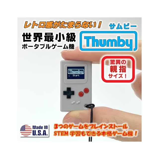 【メイド・イン・USA】Thumbyポータブルゲーム機は2012年創業で、アメリカのオハイオ州に自社工場を構えるメーカーやガジェットマニア向けの小型電子機器の専門メーカーが制作。プロトタイプの制作から、製品の組み立て、検品、出荷まで自社で行っています。さらにゲームのプログラミングも自社のエンジニアが責任を以って行っています。同社は既に100を超える電子機器商品を開発し、世界60カ国のマニアが愛用している信頼のメーカー製です。商品スペック:●サイズ/29.5×18×8.5mm●重量/4.7g●材質/PC(ポリカーボネート)●CPU/Raspberry Pi RP2040●メモリー/2M●モニター/72×40モノクロOLED●スピーカー/ピエゾスピーカー●プログラム/MicroPython●付属品/マイクロUSBケーブル