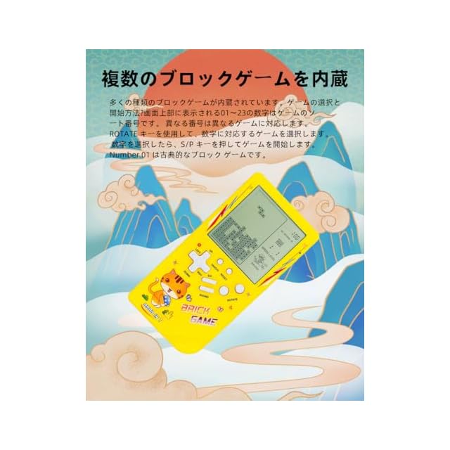 複数のブロックゲームを内蔵 多くの種類のブロックゲームが内蔵されています。ゲームの選択と開始方法?画面上部に表示される01〜23の数字はゲームのソート番号です。 異なる番号は異なるゲームに対応します。 ROTATE キーを使用して、数字に対応するゲームを選択します。 数字を選択したら、S/P キーを押してゲームを開始します。 Number 01 は古典的なブロック ゲームです。