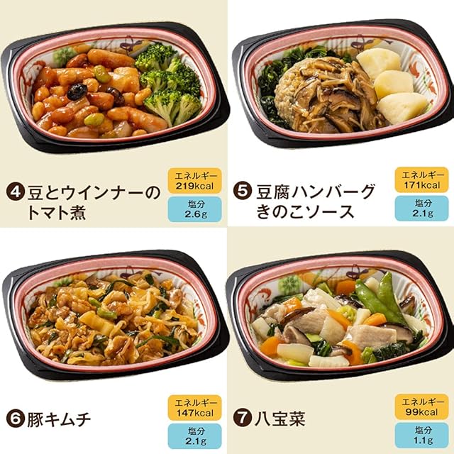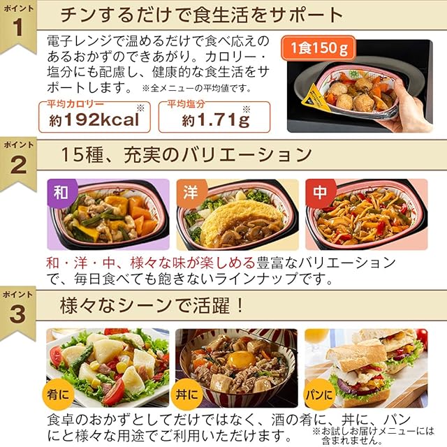 "【和洋中の冷凍おかず】<br>主菜は和洋中と煮物、お魚、お肉とバランスよくお召し上がりいただけます。健康的なバランスのいいおかずを、レンジでチンするだけの手軽さでお楽しみください。<br><br>【管理栄養士監修のヘルシーおかず】管理栄養士監修で、栄養バランスやカロリー・塩分にも配慮。必ず緑の野菜を入れており、 健康的な生活を送りたい方におすすめ!<br><br>【不足しがちな野菜たっぷり】1食150gのうち、野菜を平均約80g(※)使用しているので、不足しがちな野菜をたっぷり食べられます。 また1食5品目以上の食材を使用しているのでバランスも◎! (※)※全メニューの平均値です。<br><br>【家庭的な和洋中のお惣菜!】食べてホッとするようなやさしい味付けの和洋中のおかず!野菜がたっぷりなので、食卓の彩りもさらにUP!"