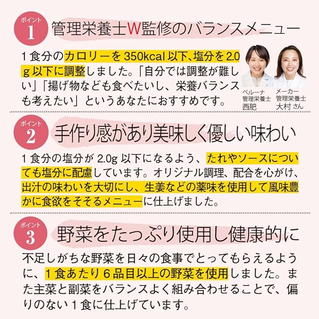 ◎ポイント2.【オリジナル配合のたれやソースで風味豊かで美味しい!】 1食分の塩分を2.0g以下に調整するために、出汁の風味をしっかり出したり、 メーカーオリジナル配合のたれやソースを使用したりしています。 他にも、生姜やねぎなどの薬味を使用することで風味豊かに仕上げています。