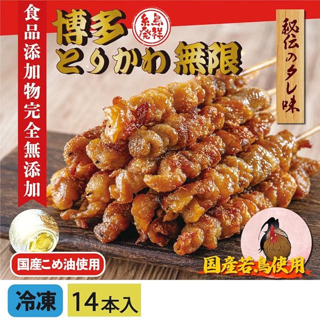 《新品未開封》博多浜や とりかわ串 焼鳥 無限 14本入(7本×2袋)国産 鶏皮 無添加 焼き鳥 冷凍 甘辛タレ 居酒屋風 おつまみ 簡単調理 電子レンジOK