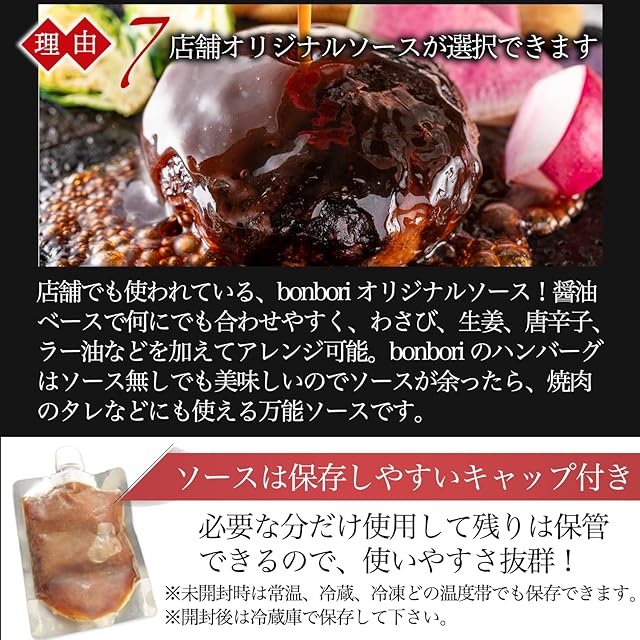 【赤身と脂身のバランス】赤身肉と濃厚な和牛の脂身をbonboriの配合でブレンドしたハンバーグのための「究極のひき肉」を使って作り上げました。牛100%濃厚ハンバーグの旨みをしっかりと閉じ込め、いつでも作り立ての美味しさをお取り寄せでお楽しみください。 【2つの味が楽しめる】濃厚なプレーンハンバーグ、チーズプラスハンバーグの、2つのハンバーグが楽しめます。ふんわり柔らかで、食べ応えのあるハンバーグです。 【濃厚な味わい】玉ねぎの甘味とコクを最大限に引き出す飴色になるまでじっくり炒めました。飴色玉ねぎとチーズは濃厚なハンバーグと最高の相性です。「焼き方マニュアル」を同封しておりますので参考にして焼いてから、まずはソース無でお召し上がり下さい。 【個別包装で使いやすい】1個ずつ個包装され、使いたい分だけ取りだせるbonboriオリジナル袋で使い勝手は抜群です。箱にぎっしり詰まったハンバーグなので、ご家庭でのおうちご飯、贅沢ディナーにオススメです。 【内容量】200g:プレーン200g3個 / チーズ入り200g3個 / bonboriオリジナルソース【保存方法】冷凍保存、3ヵ月以内にお召し上がり下さい(開封後は即日、ソースは1か月) 【付属】焼き方マニュアル