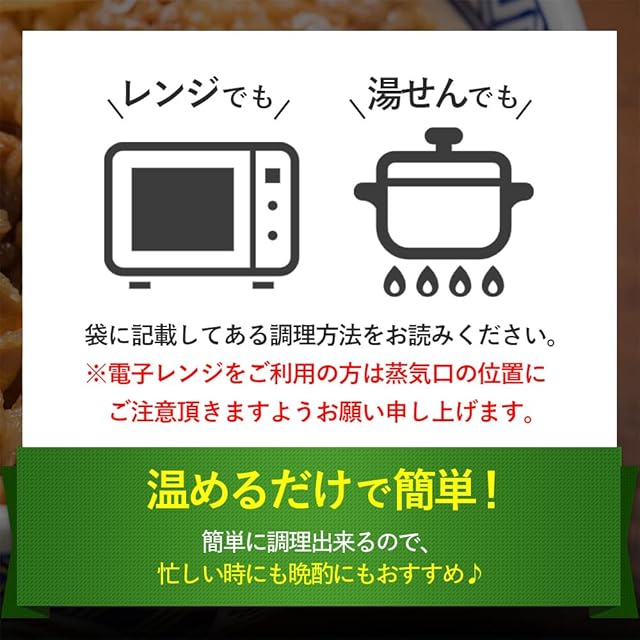 【レンジで簡単調理】外出しなくても、近くに吉野家のお店がなくても吉野家の味を楽しめます。電子レンジで簡単に調理が出来ますので、手早くご飯を済ませたい朝食やランチ、夕飯のおかず、お惣菜、おつまみのプラス一品としても、ご家庭や職場でお楽しみいただけます。
