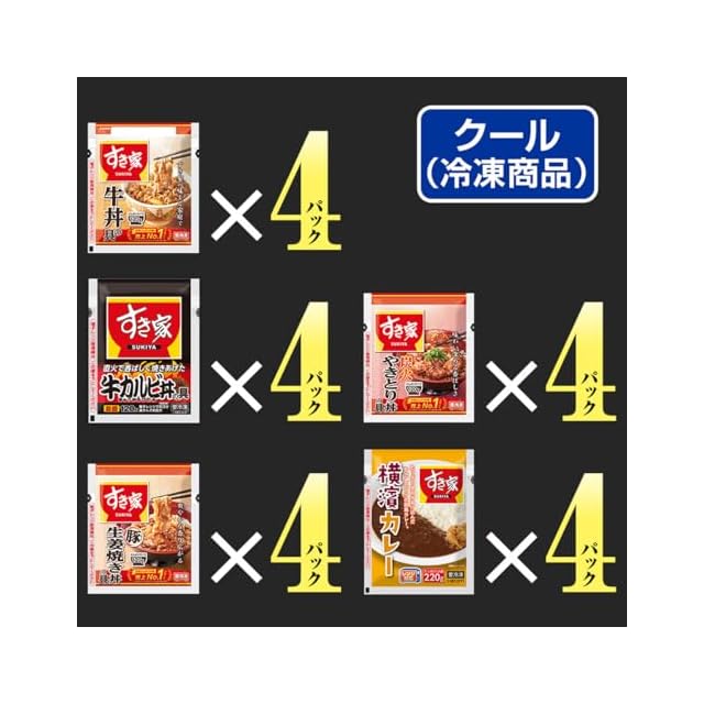 すき家「牛丼の具120g」「牛カルビ丼の具120g」「豚生姜焼き丼の具120g」「炭火やきとり丼の具120g」「横濱カレー220g」がそれぞれ4食ずつ、合計5種20食入りのお得なセットです。