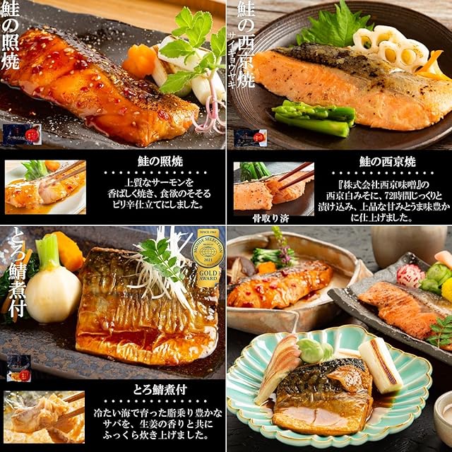 ■商品説明:■モンドセクション2021年度金賞を受賞した『とろ鯖煮付け』 ■株式会社西京味噌の西京味噌を使用した『鮭の西京焼』 ■世代問わず人気の鮭をピリ辛に味付けした、ご飯もお酒も進む『鮭の照焼』