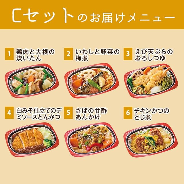 【セット内容】主菜15種:鶏肉と大根の炊いたん、おろしポン酢ソースハンバーグ、えび天ぷらのおろしつゆ、白みそ仕立てのデミソースとんかつ、さばの甘酢あんかけ、チキンかつのとじ煮、鶏肉と野菜のチリソース、厚揚げと鶏肉の白だし煮、いわしと野菜の梅煮、赤魚の白みそ煮、五目巾着と野菜の炊合せ、鶏もも肉の照焼、牛肉と白菜のすき煮、ごろごろ野菜のおばんざい豚汁、白だし京たこやき