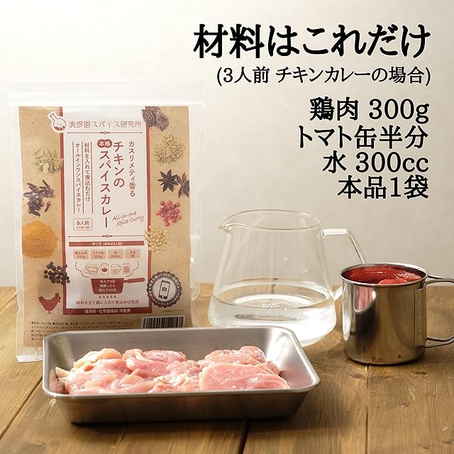 【作り方】鶏肉、豚肉など(300g)、トマト缶(200g)、水300cc、スパイスカレーの素1袋を鍋に入れて中火で5分、弱火で20分煮込むだけ。失敗なく美味しいスパイスカレーが完成。