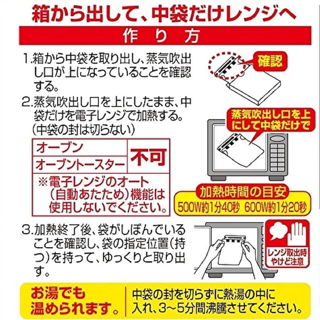 【レンジで簡単】箱から中袋を取り出し、そのまま電子レンジで加熱調理が可能です。