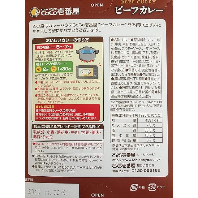 原材料名:カレールー、牛肉、牛脂、野菜(玉ねぎ、人参)、でんぷん、ウスターソース、トマトペースト、酵母エキス/調味料(アミノ酸等)、乳化剤、カラメル色素、酸味料、香料、香辛料抽出物(一部に乳成分、小麦・落花生・牛肉・大豆・鶏肉・豚肉・りんごを含む)