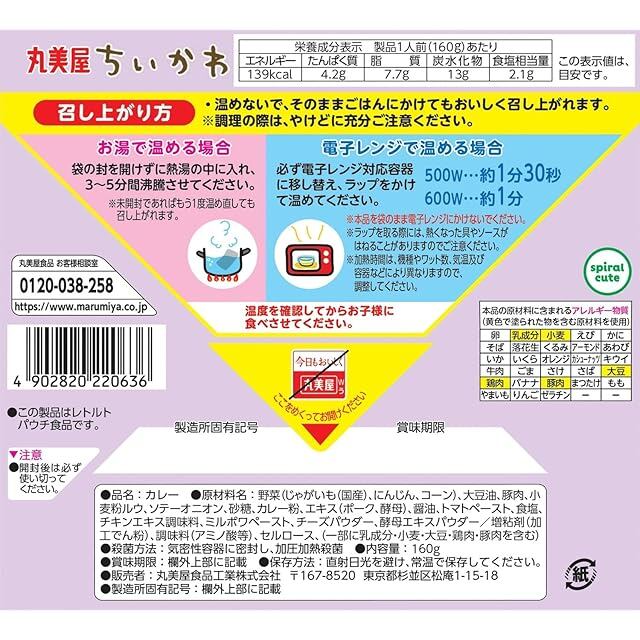 原材料:野菜(じゃがいも(国産)、にんじん、コーン)、大豆油、豚肉、小麦粉ルウ、ソテーオニオン、砂糖、カレー粉、エキス(ポーク、酵母)、醤油、トマトペースト、食塩、チキンエキス調味料、ミルポワペースト、チーズパウダー、酵母エキスパウダー/増粘剤(加工でん粉)、調味料(アミノ酸等)、セルロース、(一部に乳成分・小麦・大豆・鶏肉・豚肉を含む)