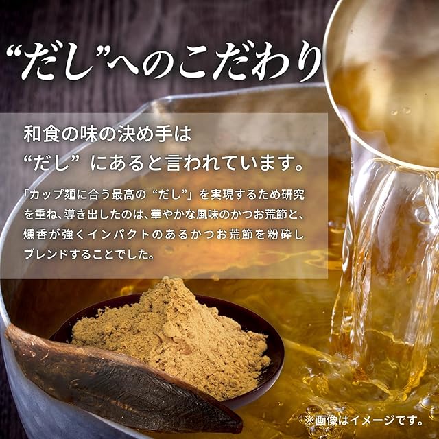 【地域ごとに配合を変えたこだわりダシ】「赤いきつね」「緑のたぬき」では地域ごとに好みや嗜好性を反映した"だし"で商品開発しています。東日本向けはしっかりした味わいであり、西日本向けはすっきりした口当たり。だし文化を大切にする姿勢から生まれるその深みある味は長く愛されています。 つゆを飲み干したあと、カップの内側にぐるりと黒い帯が残っていたことはありませんか。それは、"だし"がたっぷり入っている証拠。 「赤いきつね」「緑のたぬき」には細かく砕いたかつお節そのものが入っているのです。ぜひ、"だし"の粒を心ゆくまで味わってみてください。