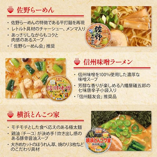 内容:札幌濃厚味噌ラーメン、仙台辛味噌ラーメン、喜多方ラーメン、佐野らーめん、信州味噌ラーメン、横浜とんこつ家、富山ブラック、京都背脂醤油味、奈良天理スタミナラーメン、尾道中華そば、熟炊き博多とんこつ、長崎ちゃんぽん
