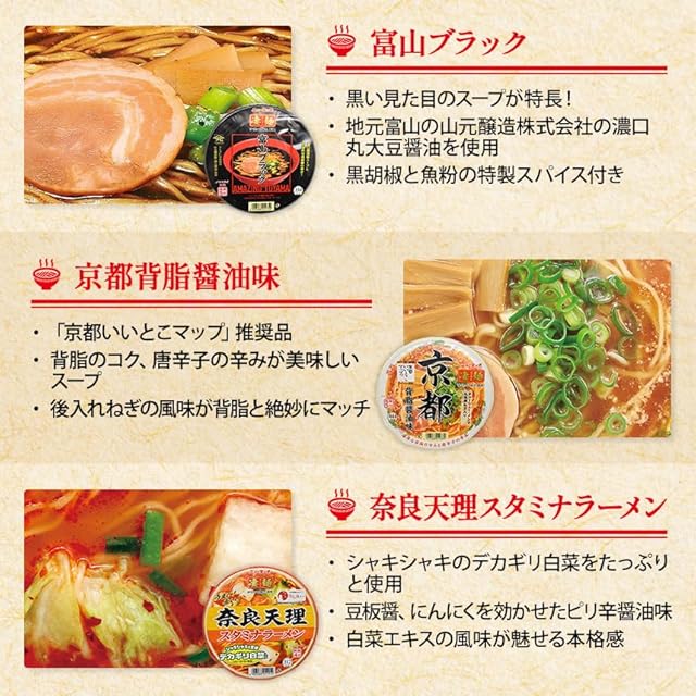 内容:横浜とんこつ家、広島尾道中華そば、佐野らーめん、熟炊き博多とんこつ、信州味噌ラーメン、長崎ちゃんぽん、仙台辛味噌ラーメン、札幌濃厚味噌ラーメン、京都背油醤油、富山ブラック、奈良天理スタミナラーメン、喜多方ラーメン