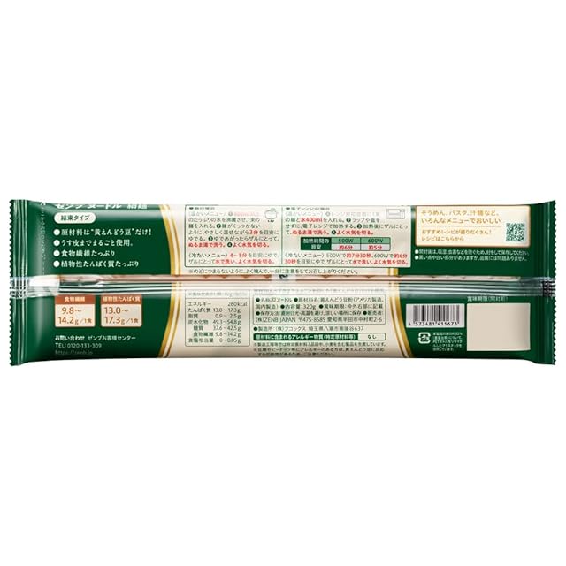 セット内容:ゼンブヌードル細麺(80g×4束)×6袋 /内容量:320g×6賞味期間:製造から24ヵ月(賞味期間はご注文日から約30日以上の商品をお届けします)原材料名:黄えんどう豆粉(アメリカ製造) 栄養成分(1食(ゆで上がり約200g)中):エネルギー 244kcal、たんぱく質 13.7g、 糖質 36.2g、食物繊維 14.2g、鉄分4.2mg