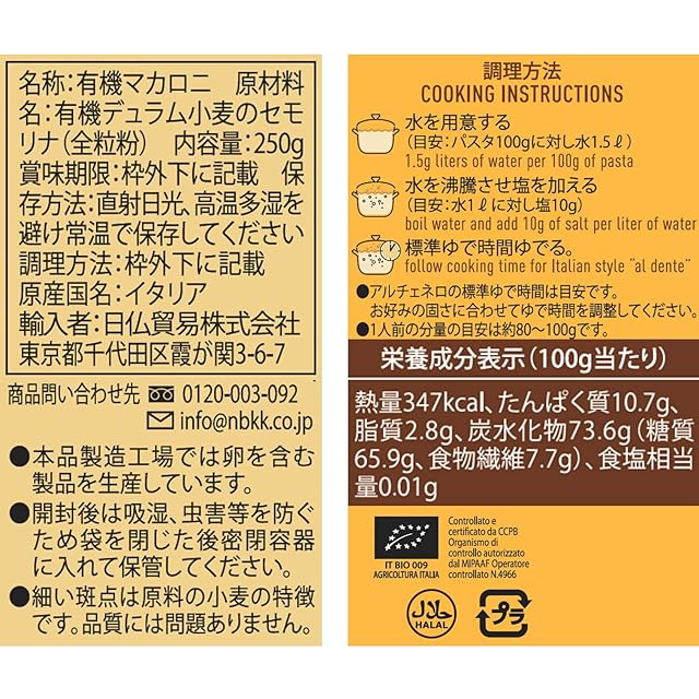 【原材料】有機デュラム小麦のセモリナ(全粒粉)【内容量】250g 【原産国】イタリア 【ゆで時間】10分