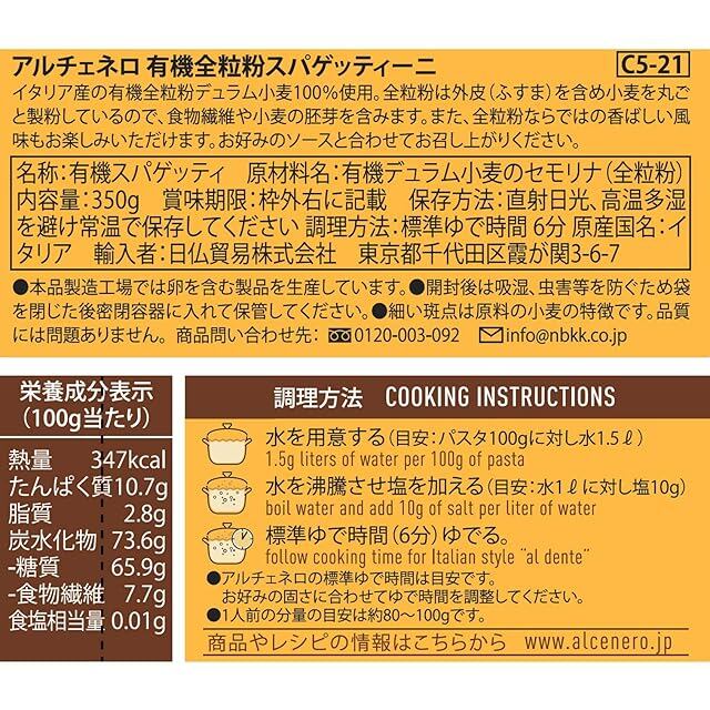 【原材料】有機デュラム小麦のセモリナ(全粒粉)【内容量】350g【原産国】イタリア 【太さ】1.4㎜【ゆで時間】6分