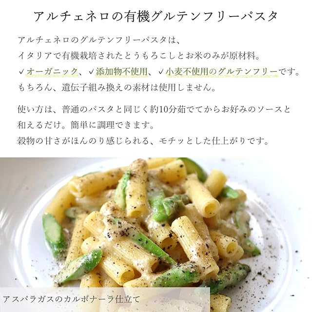 【小麦粉不使用】原料はイタリアで有機栽培したとうもろこしと米のみ。通常のパスタ同様に調理できます。穀物の甘さがほんのり感じられる、もちっとした仕上がり。有機JAS認証、EUオーガニック認証取得。