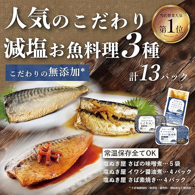 《新品未開封》塩ぬき屋 減塩 無添加 お魚料理3種 計13セット(さば味噌煮5点・さば素焼き4点・いわし醤油煮4点) / 常温保存 長期保存 美味しい おかず 惣菜 レトルト 防災食 保存食 惣菜 国産 詰め合わせ 煮魚 焼き魚