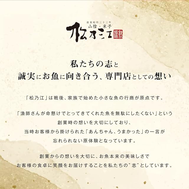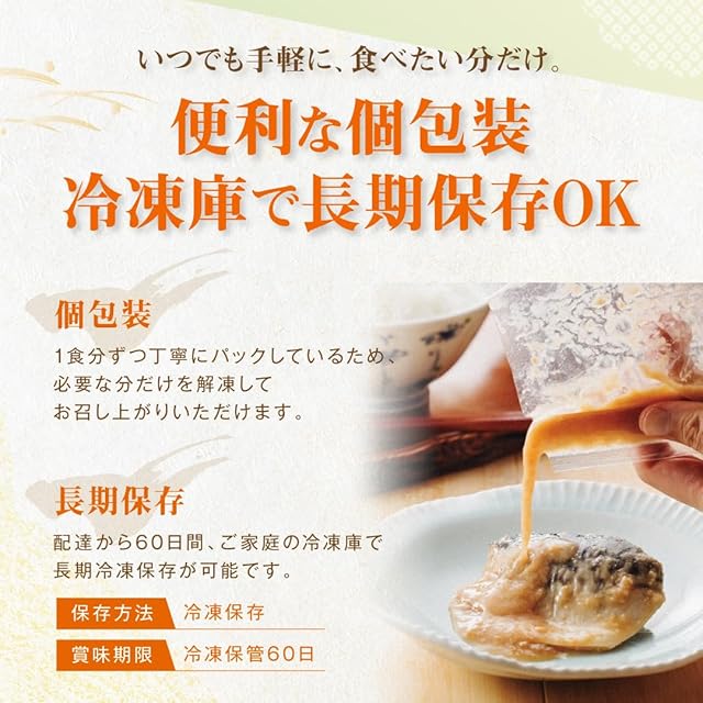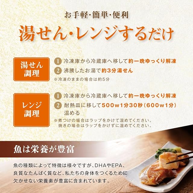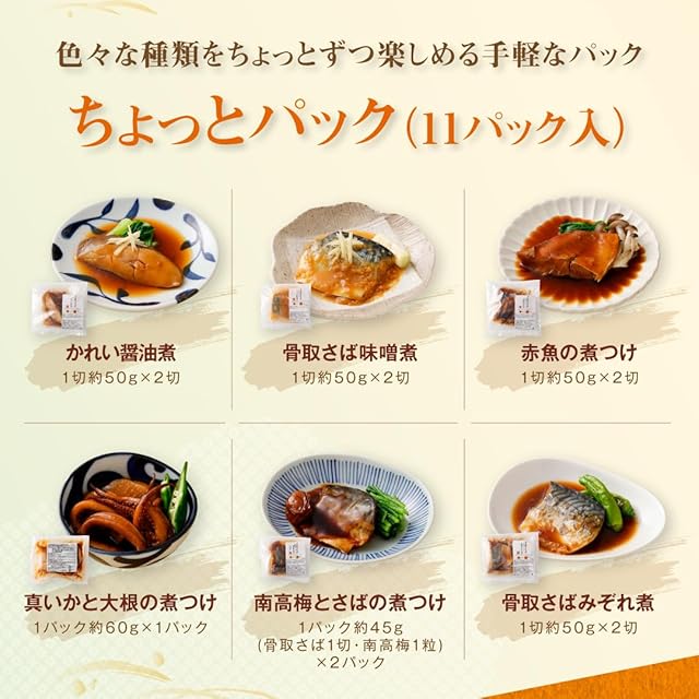 ちょっとパック(11パック入)<br> ・かれい醤油煮〈1切約50g×2切〉<br> ・骨取 さば味噌煮〈1切約50g×2切〉<br> ・骨取 赤魚の煮つけ〈1切約50g×2切〉<br> ・真いかと大根の煮つけ〈1パック約60g×1パック〉<br> ・骨取 南高梅とさばの煮つけ〈1パック約45g(骨取さば1切・南高梅1粒)×2パック〉<br> ・骨取 さばみぞれ煮〈1切約50g×2切〉<br> ちょっとつ、いろんな種類食られる、とても手軽なックす。<br> 「たくさんの量を食られない年代の方々に、おいしくて健康によい料理を少しつ、何種類も食て頂きたい。」 この「ふっくら焼き・しっとり煮 ちょっとック」には、開発担当者の、そんな真剣な思い込められています。 「いのちの源は食にあり」という、松乃江の食品くりの原点にこわりなら試作を重ね、丁寧な調理法から生まれたメニューは自慢の味に仕上りました。<br> <br> 魚持つ栄養を、松乃江ならはの滋味豊かな味わい楽しめる「ふっくら焼き・しっとり煮 ちょっとック」。<br> 調理法はとても簡単。<br> 電子レン袋から商品をお皿に移して温めるか、湯せんするけ。<br> もう一品、食卓に彩りを添えたいときや、晩酌のつまみなとしても重宝します。<br> 一人暮らしの方や、お子様なも十分に食きれる量、とても嬉しいックす。<br> <br> 原材料<br> 【かれい醤油煮】カラスカレイ(ドイツ)、醤油(大豆・小麦を含む)、糖類混合品(ぶどう糖果糖液糖、水あめ、砂糖)、還元水あめ、 砂糖、生姜、澱粉分解物、寒天、みりん、増粘剤(加工澱粉)熱量146kcalたんぱく質6.3g脂質8.9g炭水化物10.5g食塩相当量1.3g【さば味噌煮】サバ(ノルウェー)、みそ(大豆を含む)、砂糖、 みりん、水あめ、生姜、食塩熱量226kcalたんぱく質9.9g脂質15.7g炭水化物11.4g食塩相当量1.6g【さばと南高梅の煮つけ】サバ(ノルウェー)、調味梅干(梅(国産)、果糖、その他)、醤油、みりん、砂糖、砂糖結合水飴、還元水飴、醸 造酢、でん粉分解物、生姜、増粘剤(加工でん粉)、pH調整剤、 カラメル色素、(一部に小麦・大豆を含む)熱量162kcalたんぱく質8.2g脂質10.7g炭水化物8.7g食塩相当量1.8g【さばのみぞれ煮】サバ(ノルウェー)、大根(国産)、醤油、みりん、砂糖、 たん白加水分解物、発酵調味料、ぶどう糖果糖液糖、寒天、 食塩/増粘剤(加工でんぷん)、着色料(カラメル)、一部に大豆・ 小麦を含む)熱量200kcalたんぱく質8.9g脂質14.2g炭水化物9.4g食塩相当量1.6g【赤魚の煮つけ】アカウオ(アメリカ)、醤油(大豆・小麦を含む)、還元水あめ、みりん、砂糖、カツオだし、昆布エキス、酵母 エキス、増粘剤(加工澱粉)、着色料(カラメル)熱量85kcalたんぱく質10.7g脂質1.5g炭水化物7.0g食塩相当量1.3g【いかと大根の煮つけ】スルメイカ(境港産)、大根(国産)、醤油(大豆・小麦を含む)、砂糖、みりん、還元水あめ、砂糖結合水あめ、 醸造酢、でん粉分解物、生姜、調味エキス、昆布エキス/増粘剤(加工でん粉)、pH調整剤、着色料(カラメル)、調味料(有機酸等)、(一部に大豆・小麦を含む)熱量76kcalたんぱく質10.8g脂質1.0g炭水化物5.9g食塩相当量1.4g