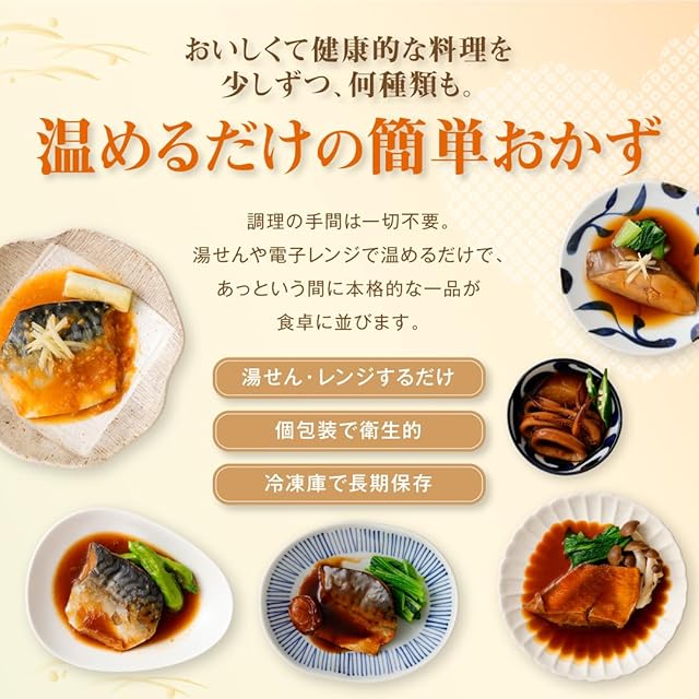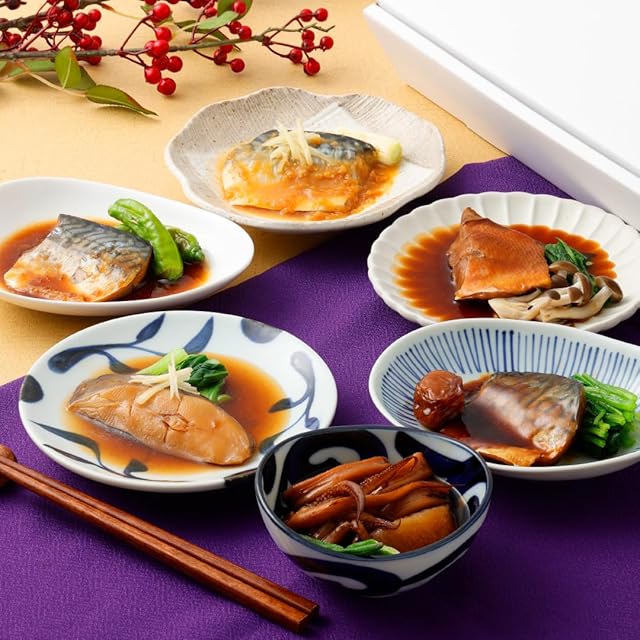 内容量: ・かれい醤油煮〈1切約50g×2切〉 ・骨取さば味噌煮〈1切約50g×2切〉 ・赤魚の煮つけ〈1切約50g×2切〉 ・真いかと大根の煮つけ〈1パック約60g×1パック〉 ・南高梅とさばの煮つけ〈1パック約45g(骨取さば1切・南高梅1粒)×2パック〉 ・骨取さばみぞれ煮〈1切約50g×2切〉