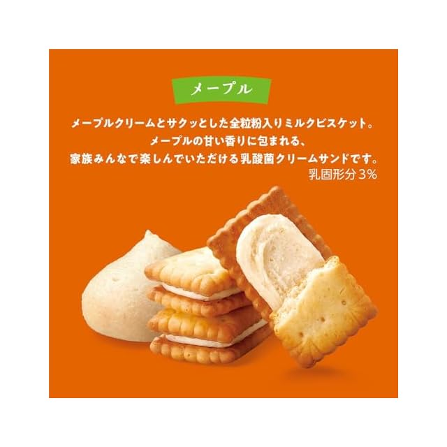 原材料:小麦粉(国内製造)、砂糖、ショートニング、乳糖、小麦全粒粉、植物油脂、全粉乳、イヌリン、メープルシュガー、キャラメルパウダー、発酵液、食塩、小麦たんぱく、でん粉、乳酸菌/炭酸Ca、膨脹剤、香料、乳化剤、V.B1、V.B2、V.D、(一部に乳成分・小麦を含む)