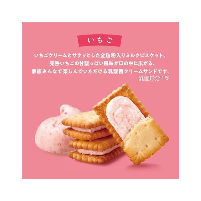 原材料:小麦粉(国内製造)、砂糖、ショートニング、乳糖、小麦全粒粉、植物油脂、イヌリン、全粉乳、いちごパウダー、発酵液、食塩、小麦たんぱく、でん粉、乳酸菌/炭酸Ca、膨脹剤、香料、乳化剤、酸味料、V.B1、V.B2、V.D、(一部に乳成分・小麦を含む)