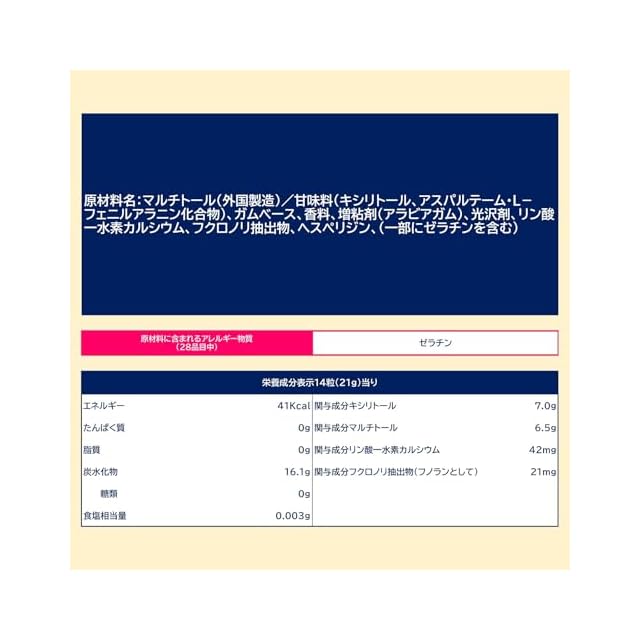 原材料:マルチトール(外国製造)/甘味料(キシリトール、アスパルテーム・L-フェニルアラニン化合物)、ガムベース、香料、増粘剤(アラビアガム)、光沢剤、リン酸一水素カルシウム、フクロノリ抽出物、ヘスペリジン、(一部にゼラチンを含む)