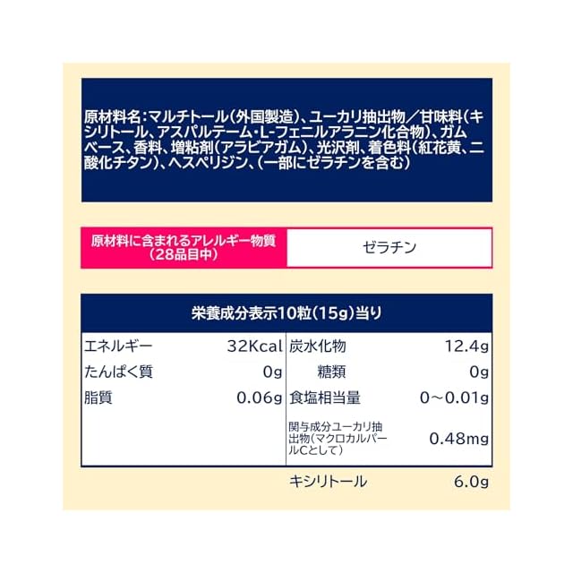 原材料:マルチトール(外国製造)、ユーカリ抽出物/甘味料(キシリトール、アスパルテーム・L-フェニルアラニン化合物)、ガムベース、香料、増粘剤(アラビアガム)、光沢剤、着色料(紅花黄、二酸化チタン)、ヘスペリジン、(一部にゼラチンを含む)