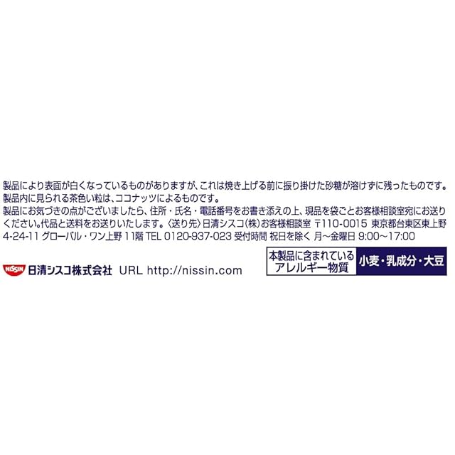 原材料: 小麦粉(国内製造)、砂糖、ショートニング、ココナッツオイル、ココナッツ、発酵バター、食塩、発酵乳風味パウダー/膨張剤、乳化剤(大豆由来)、香料、酸味料、酸化防止剤(ビタミンE)
