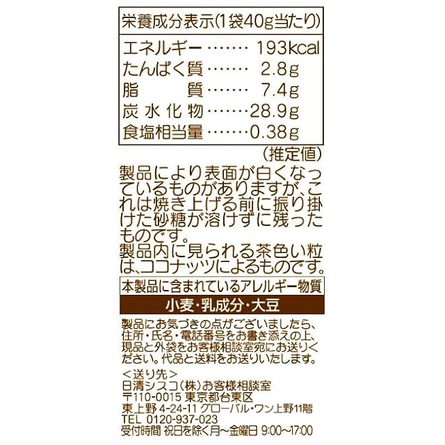 原材料: 小麦粉(国内製造)、砂糖、ショートニング、ココナッツオイル、ココナッツ、食塩、脱脂粉乳/膨張剤、乳化剤(大豆由来)、香料