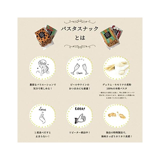 パスタスナックは、独自の特殊製法で後味さっぱりカリカリ食感。豊富なバリエーションで気分で楽しめる。ビールやワインのおつまみにも最適です。