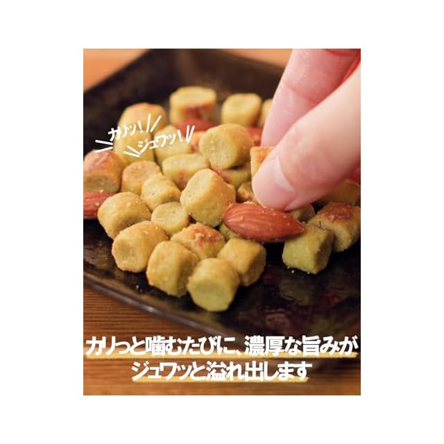 原材料:小麦粉(国内製造)、植物油脂、乾燥ポテト、アーモンド、ショートニング、でん粉、えだまめパウダー、小麦たんぱく、チキンエキスパウダー、野菜エキスシーズニング、食塩、砂糖、乾燥ビール酵母、こんぶエキスパウダー、イースト/トレハロース、調味料(アミノ酸等)、香料、乳化剤、クチナシ色素、(一部に乳成分・小麦・大豆・鶏肉・豚肉・ゼラチン・ごま・アーモンドを含む)