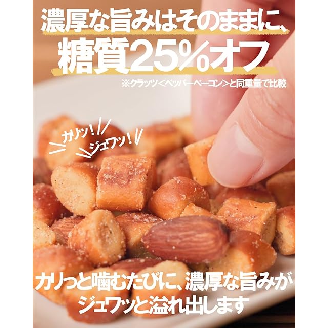 原材料:小麦粉(国内製造)、植物油脂、アーモンド、でん粉、砂糖、オニオンペースト、ポークエキスパウダー、ショートニング、にんにくパウダー、モルトエキス、チキンエキスパウダー、小麦たんぱく、食塩、しょうゆシーズニング、こしょう、乾燥ビール酵母、酵母エキスパウダー、ベーコンエキス、たまねぎシーズニング、イースト/加工デンプン、調味料(アミノ酸等)、香料、乳化剤、くん液、(一部に乳成分・小麦・大豆・鶏肉・豚肉・ごま・アーモンドを含む)