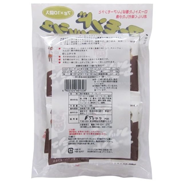 原材料:アーモンド(米国産)、かたくちいわし(国内産)、砂糖、ごま、醤油〔大豆(遺伝子組換えでない)・小麦を含む〕、澱粉分解物、食塩、トレハロース、調味料(アミノ酸等)
