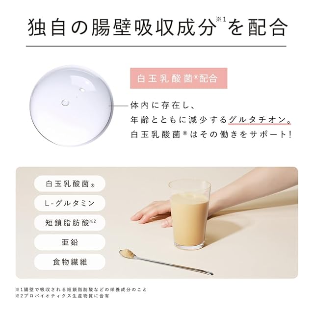 ■プロテインパウダーとして日本初配合となる白玉乳酸菌をはじめとする腸壁吸収成分※1が、腸活※2をサポート ※1腸壁で吸収される短さ脂肪酸などの栄養成分の事 ※2腸活とは腸に存在する善玉菌や善玉菌のエサとなる食物繊維を摂取する食生活のこと