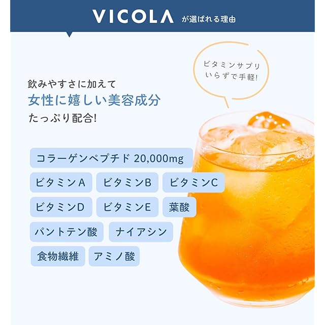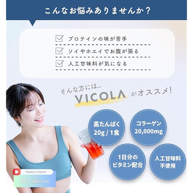 【プロテインが飲めない人のために作りました。】人気YouTuber Miyako(みやこ)監修! ホエイ・ソイのようなミルク感のない、軽やかでクリアな味わいの新感覚プロテインです。 【たんぱく質不足に】1杯(30g)に20gの高たんぱくプロテイン! 20,000mgのコラーゲンペプチドを贅沢配合。肌のハリ、弾力、関節等をサポートします。 【ビタミン11種配合+食物繊維3g】ビタミンA、B1、B2、B6、B12、C、D、Eをはじめとする11種をバランスよく配合した栄養機能食品。マルチビタミン不要の高配合! 【人工甘味料不使用】VICOLAは植物由来の甘味料のみを使用。人工甘味料特有の後味がないからよりスッキリとした飲みやすさを実現しています。 【暑い季節にぴったり!】クリアな飲み心地だから運動後にもゴクゴク飲めちゃう!仕事中のリフレッシュや気象直後でも、重さがないので気軽に飲めます。 【ホエイやソイが体に合わない方でも◎】「乳糖が体に合わない」「プロテインが重くて苦手」「人工甘味料が気になる」そんな方のために作ったプロテインです。