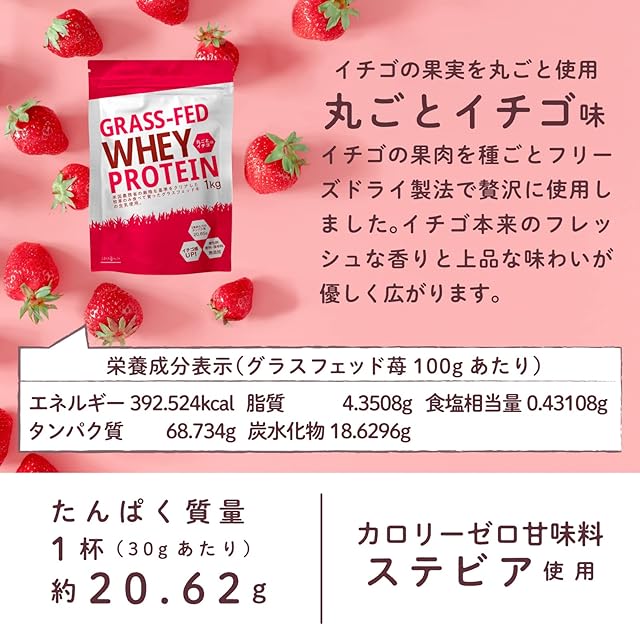 【内容量】1000g 【特徴】WPC80のホエイプロテイン100% 【保存】便利なスタンド型チャック付袋入り【原材料名】乳清たんぱく(オーストラリア製造)、いちごパウダー(いちご、乳糖、ブドウ糖)/甘味料(ステビア)、(原材料の一部に乳を含む)