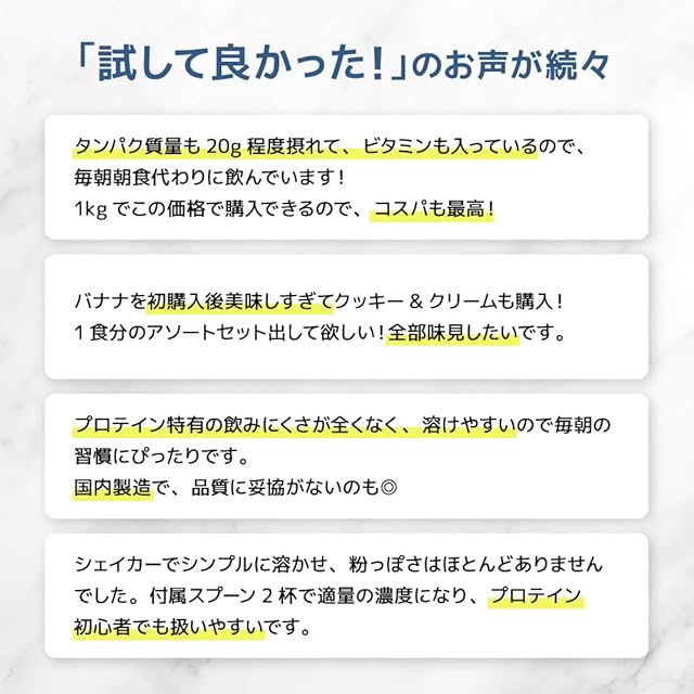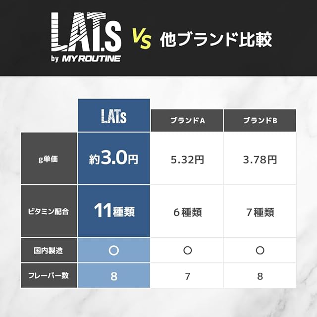 毎日をもっとハッピーに。 LAT.s(ラット)プロテインは、【おいしさ・飲みやすさ・栄養バランス】のすべてにこだわった、新しいホエイプロテインです。 【WHEYプロテイン100%使用】 吸収スピードが速く、体づくりに最適なホエイプロテインを100%使用。理想のカラダづくりをサポートします。 【アミノ酸スコア100】 必須アミノ酸をバランスよく含み、効率よくカラダに届く設計。質にこだわるあなたの強い味方に。 【ビタミン11種配合】 日常生活で不足しがちな11種のビタミンを一度にチャージ。健康的でアクティブな毎日を応援します。 【毎日飲みたくなるおいしさ】 独自の配合で「フレーバー」と「溶けやすさ」を両立。甘すぎず、後味もスッキリ。初心者でも続けやすい味わいです。 【国内製造&高コスパ設計】 安心の国内工場で製造し、コストパフォーマンスにもこだわりました。プロテイン×ビタミンをこの1杯で。 運動後の栄養補給に、 忙しい朝の置き換えに、 日々のコンディショニングに。 あなたの毎日に、LAT.sを。