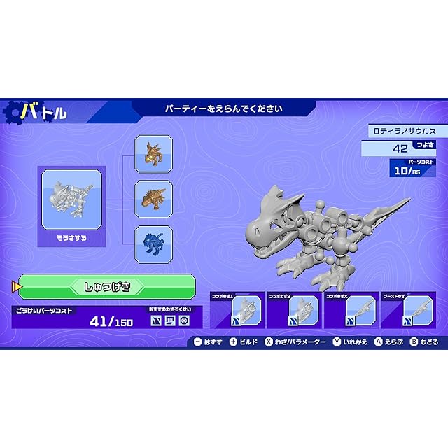 《組み立て方は無限大?! ビルドモードでオリジナルのほねほねザウルスを作ろう!》ビルドモードでは、実際の玩具菓子と同様に、さまざまなパーツを組み立てたり、組みかえることで、プレイヤーが思い描く、強くカッコいいほねほねザウルスを好きなだけ作ることができます。 組み立てに必要なパーツは、600種類以上を収録。頭、胴体、手、足などの部位ごとに多数のバリエーションが用意されており、ゲームを進めていく中で次々に入手し使用することができます。