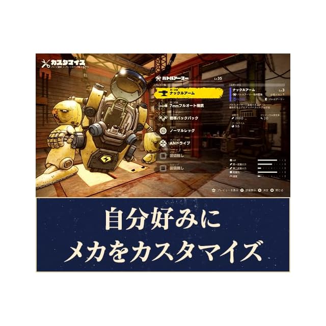 ■多彩なメカアクション ベルゼブブが操作するメカは、射撃や近接攻撃など戦闘スタイルに特徴があり、カスタマイズするメカパーツによって攻撃バリエーションが変化する。 強力な主砲を持つ「戦車」、砂漠を疾走する「バイク」、高所に登る「ジャンプメカ」など、多彩なメカを操作して、サンドランドの世界を隅々まで冒険しよう! ■君だけのメカを生み出すカスタマイズ 冒険の途中で入手できるメカパーツは数百種類。メインウェポンにサブウェポン、エンジン、足回りなど、好みに合わせてメカをカスタマイズできる。 さらに、カラーリングやデカールを組み合わせて、君だけのオリジナルのメカを作り出そう!