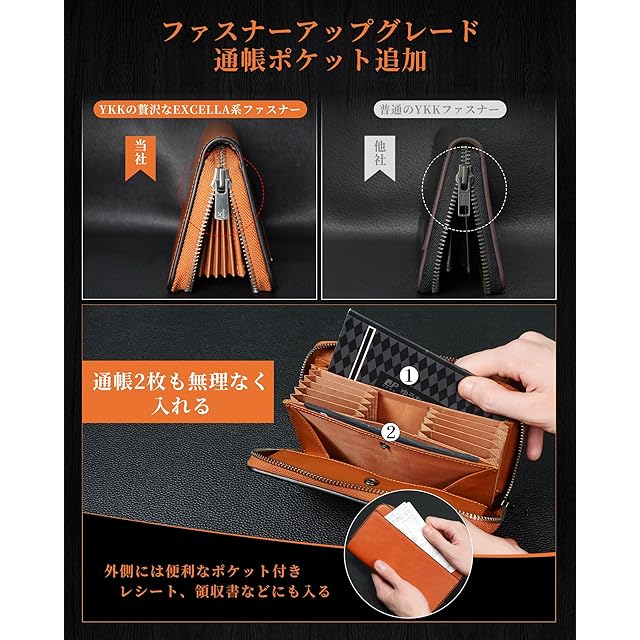 【使いやすいコンパクトサイズ】本革財布を開けると、カードがそれぞれ独立して立ち並ぶので見やすく出し入れしやすい。キャッシュレス時代に最適でカード決済に抜群の実力を発揮する、時短長財布です。「お支払いの動線」を意識し、従来のメンズ長財布を基づいて、「通帳ポケット」を追加し、おろしたお金をしまいつつ、通帳も一緒に持ち運びが出来て便利です。小銭だけではなく、鍵・領収書などの収納にも最適です。外側ポケットにカード入れがあるので、頻繁に使いそうなものをしまっておくことができます。