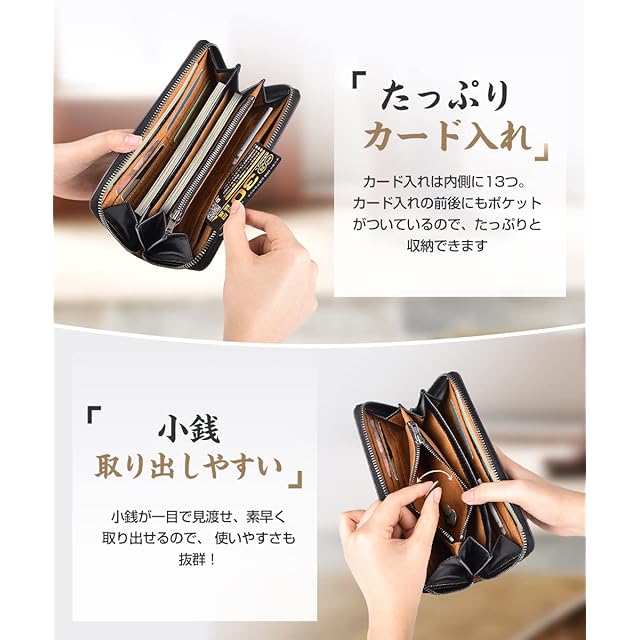 【高級素材・シンプルなデザイン】 余計な装飾はせず、「シンプルで使いやすい」をこだわりました。手の中に納まるサイズながら小銭入れのマチを広めにとって小銭を出しやすくしたり、カードの出し入れもスムーズに行えるように設計しています。ベーシックな小銭入れつきの長財布で、カード入れは13枚分つき。 背面にもポケットつきでレシートやチケットなどの収納までも、いつでも綺麗に整理できます。