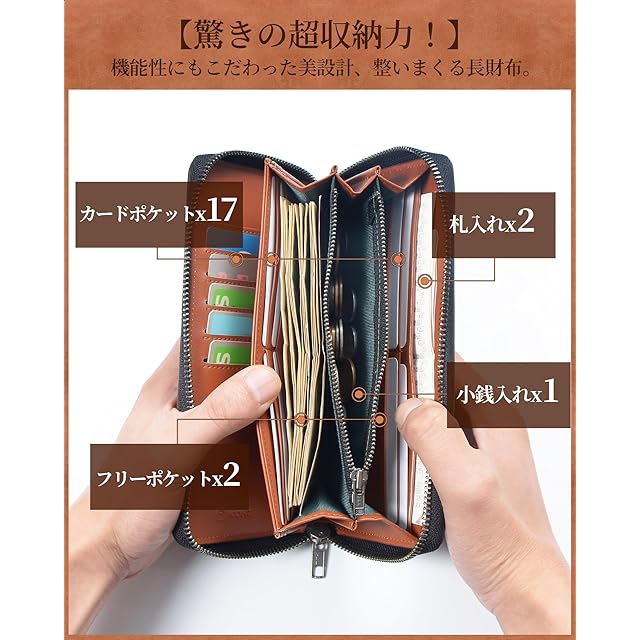 「MODIKO長財布を選ぶ4つの理由」 ① 一目でわかるデザイン:ファスナーを開けると全てが見え、カードやお札の取り出しが簡単で使いやすいです。 ② フリースペース付きデザイン:名刺、診察券、保険証、免許証などを収納可能で、「折れない・汚れない・曲がらない!」特徴があります。 ③ 小銭入れが広く開く設計:マチを設けているため、多くのコインを収納しやすく取り出しもスムーズです。 ④ 縦型カード入れデザイン:自然な取り出しができ、使い勝手がスマートです。 財布本体サイズ:縦100mm×横19.5mm×厚さ2.2mm 重さ約240g 収納可能スペース:フリーポケット×2 カードポケット×17 小銭入れ×1(ファスナー 式) 札入れ×2 隠しポケット×1 全体23個