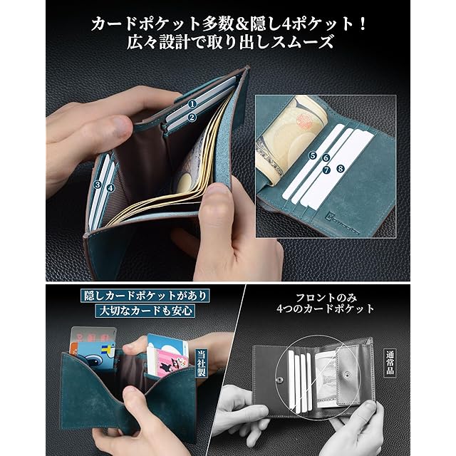 【マグネット式小銭入れ&隠しカードポケット】マグネット式のコインケースは、支払いをスムーズにし、さらに見た目も美しく仕上げています。メンズ財布の外側の4つのカードポケットに加え、メインお札入れにも4つの隠しカードポケットがあり、あまり使わないカードや身分証明書、クレジットカード、運転免許証などプライバシー重視のカードを収納できます。
