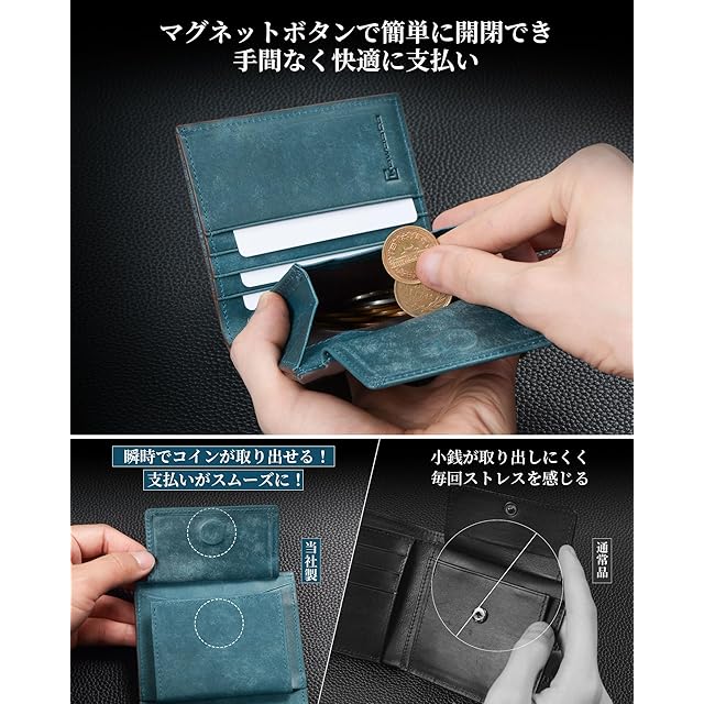 【コンパクトで大容量のメンズ財布】二つ折り財布のサイズはわずか10.5×9cmですが、収納力は妥協していません。2つのお札入れで最大30枚の紙幣、最低8枚のカードを収納可能です。マグネット式の小銭入れは最大20枚の硬貨に対応しています。