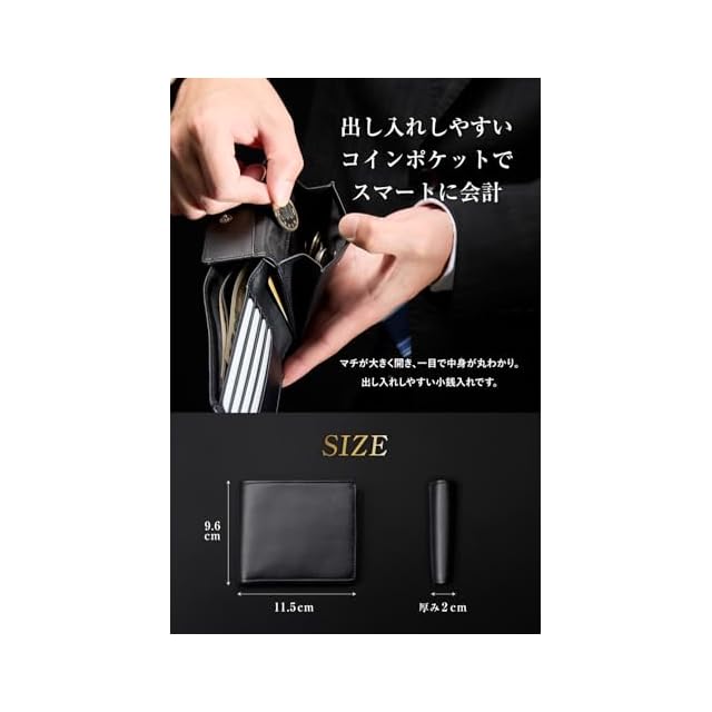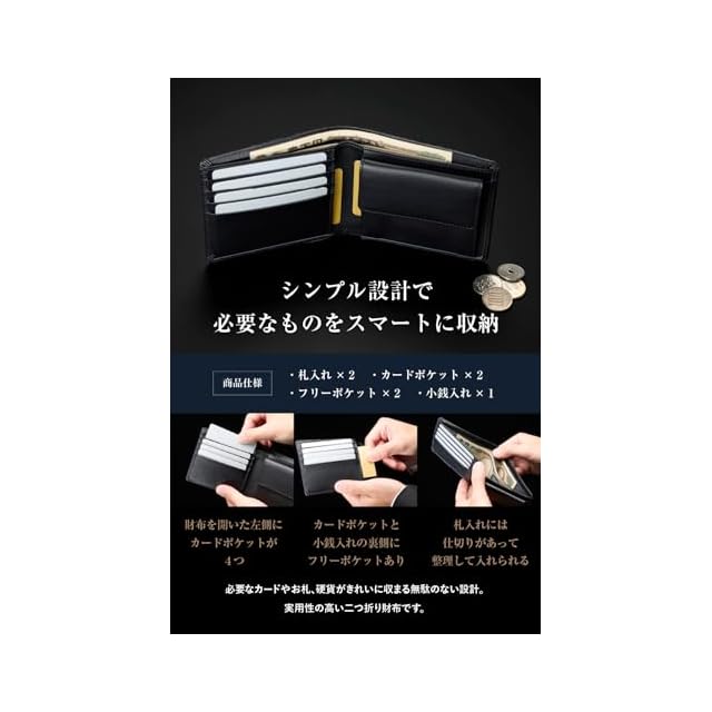 【シンプル設計で必要なものをスマートに収納】マチが大きく開いて出し入れしやすいコインポケット。一目で中身が分かり、小銭の出し入れがしやすいです。財布を開いた左側にカードポケットが4つあり、カードポケットと小銭入れの裏側にフリーポケットが1つずつあり、カードもたくさん収納可能。札入れには仕切りがあって、お札や領収書などを整理して入れられます。必要なカードやお札、硬貨がきれいに収まる無駄のない設計。実用性の高い二つ折り財布です。